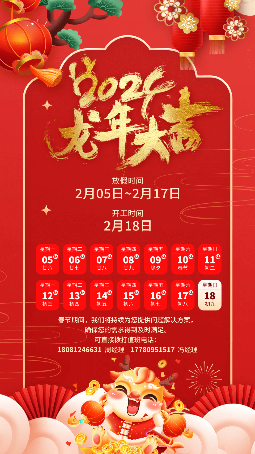 2024年新春佳節將至,根據國家的法定節假日規定及結合本公司實際情況,現將2024年春節放假時間作如下安排: