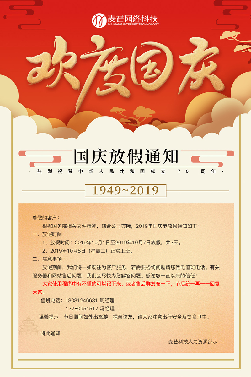 根據(jù)國務(wù)院相關(guān)文件精神,結(jié)合公司實(shí)際,2019年國慶節(jié)放假通知如下: